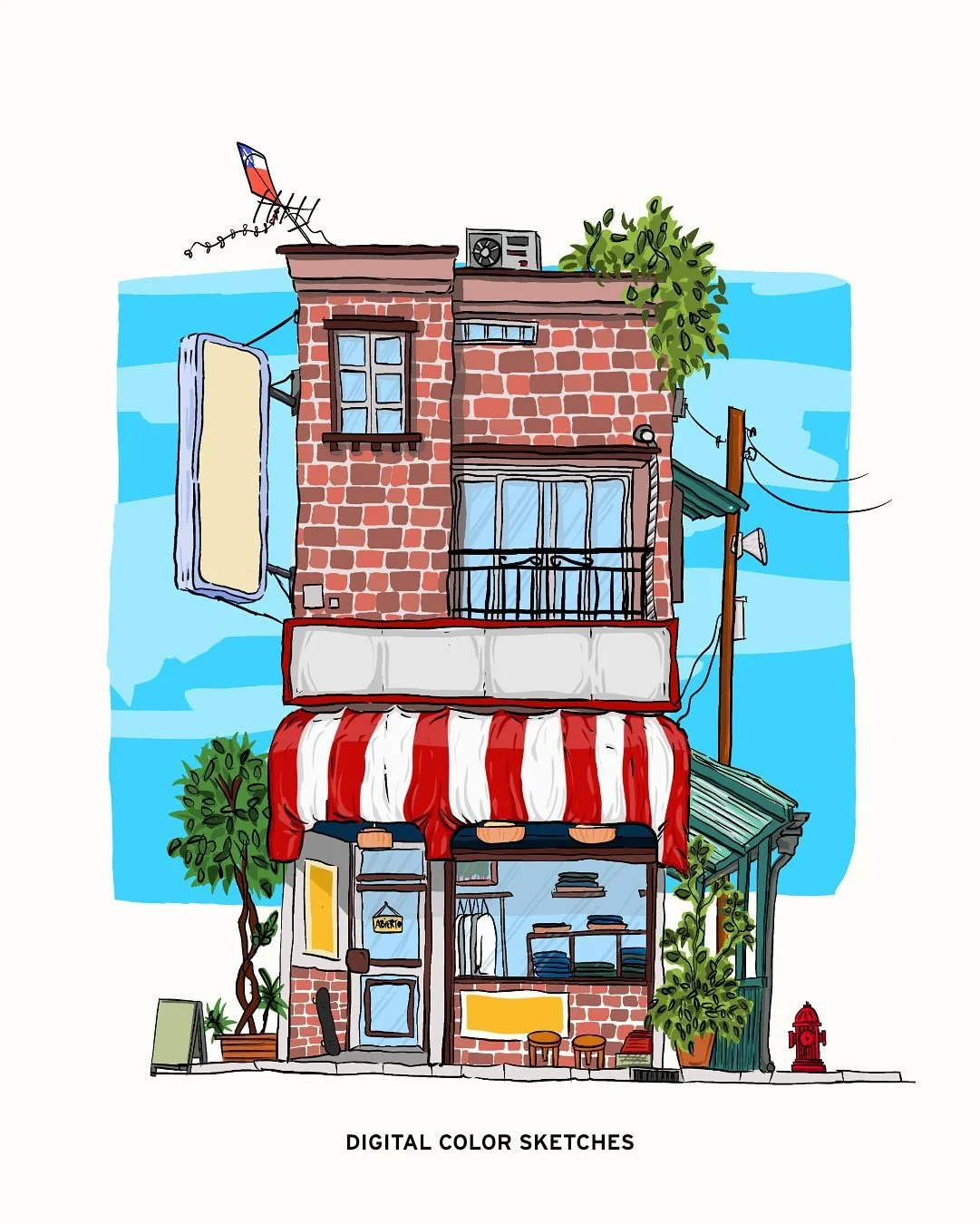 View fullsize Lately I have been drawing these little urban worlds. Black lines sketches and bringing them to life with color and texture. I love buildings places that feel alive, full of details you only notice when you slow down.
